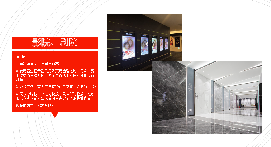 实际应用中,数聚梨联联屏以上特点可以为客户提供相较传统拼接大屏更先进、更方便、更优惠的选择。在影院、地铁、商业综合体等的宣传中更是不可或缺的存在。
