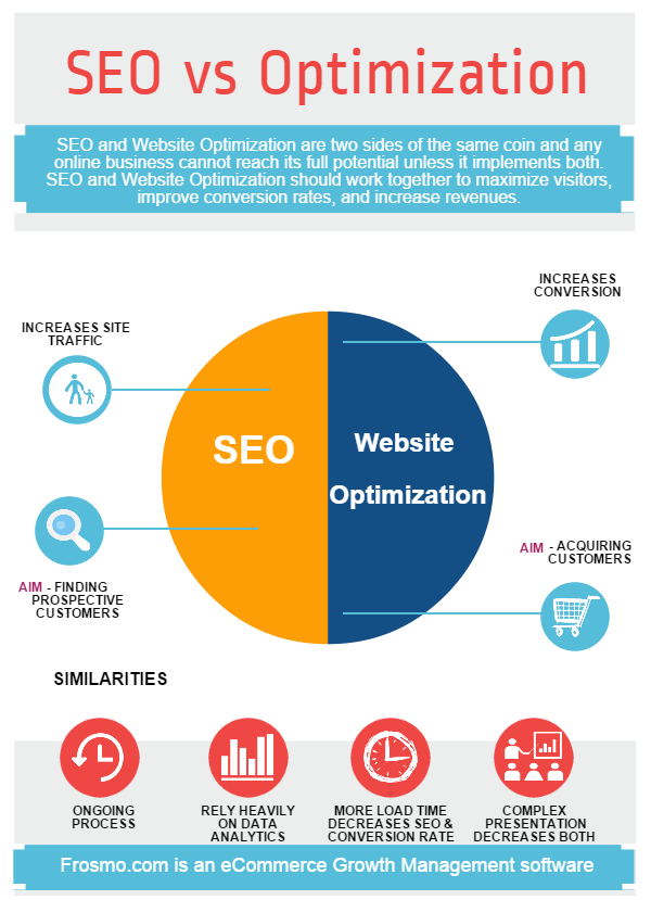 SEO aims at finding prospective customers based on what they are searching for and providing them with a reason to visit the website, while the aim of website optimization is creating the best possible user experience once a prospective customer visits the site so that the customer ends up buying the product or service. In simple terms, it can be said that website optimization increases conversion whereas SEO increases traffic to the site.