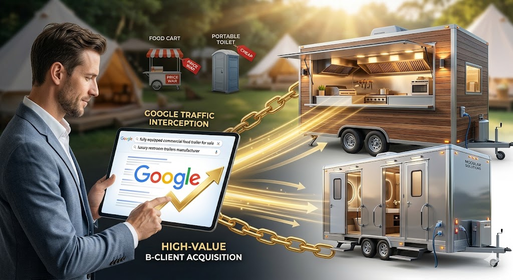 传统的 SEO 做法是死磕 “food cart” 或 “portable toilet” 这种极其泛滥且廉价的词。但事实上,真正要花几万美金采购定制拖车的老板,他们的搜索习惯是非常直接的“带资采购”模式,不仅搜索量更大,而且带有极强的商业定制与寻找源头工厂的意图: